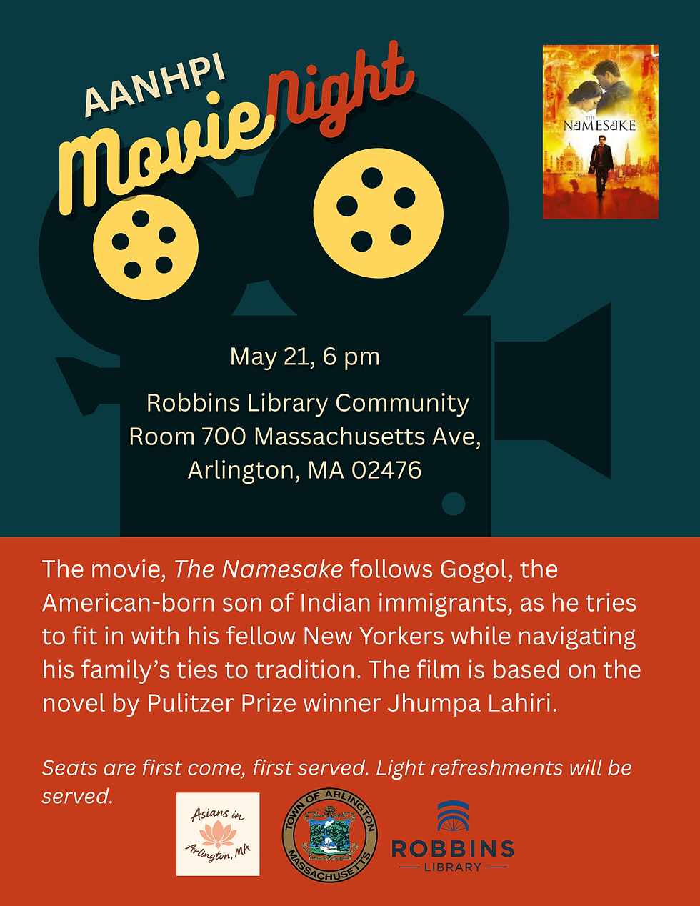 To celebrate Asian American, Native Hawaiian, and Pacific Islander Heritage Month there will be a free showing of “The Namesake” (rated PG-13), at the Robbins Library Community Room on May 21th at 6pm. The film is about American-born Gogol, the son of Indian immigrants, who wants to fit in among his fellow New Yorkers despite his family's unwillingness to let go of their traditional ways. “The Namesake” is based on the novel by Pulitzer Prize winner Jhumpa Lahiri.